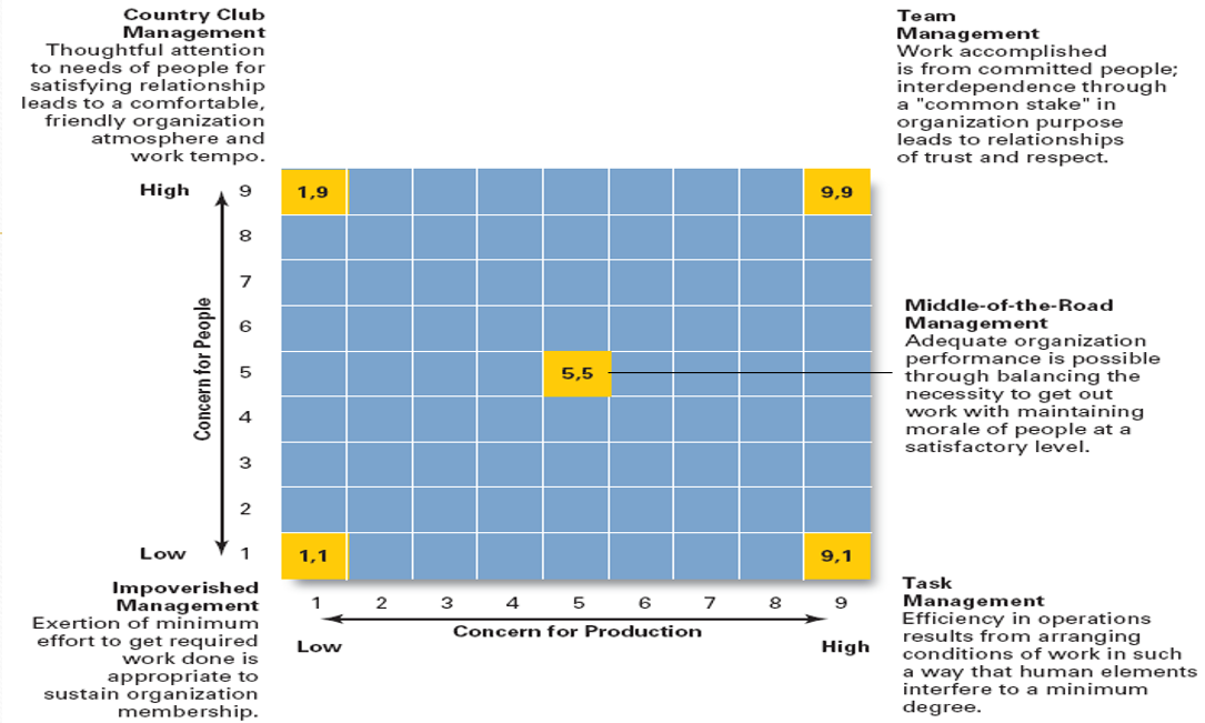This grid theory was proposed by Robert Blake and Jane Mouton in 1964. It depicted leaders on 2 axes.