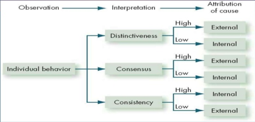 - Example: If many employees are late to work because of heavy traffic (high consensus), Jane is usually on time but late today (low consistency), and she is not late to other events (high distinctiveness), one might attribute her lateness to the unusual traffic (external attribution).